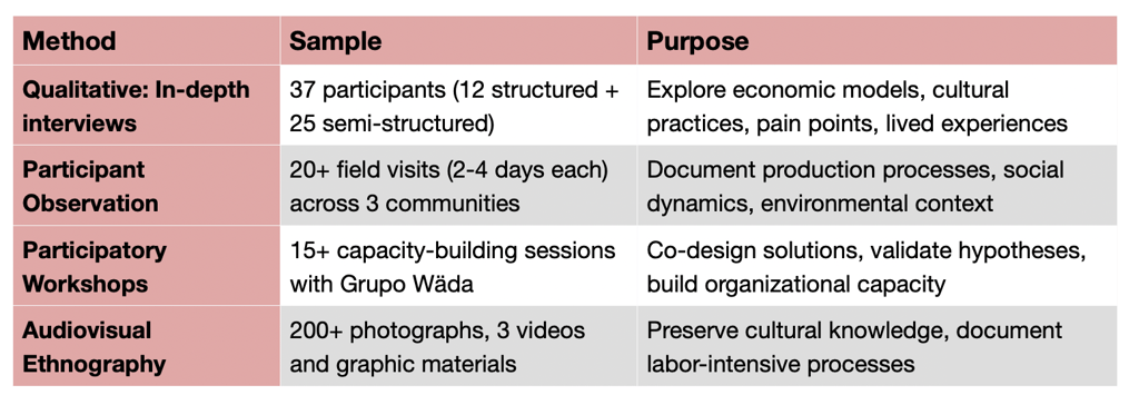 Through 11 months of immersive ethnographic research, I conducted 37 in-depth interviews, facilitated 15+ participatory workshops, and co-designed solutions with the Grupo Wäda artisan cooperative that achieved: