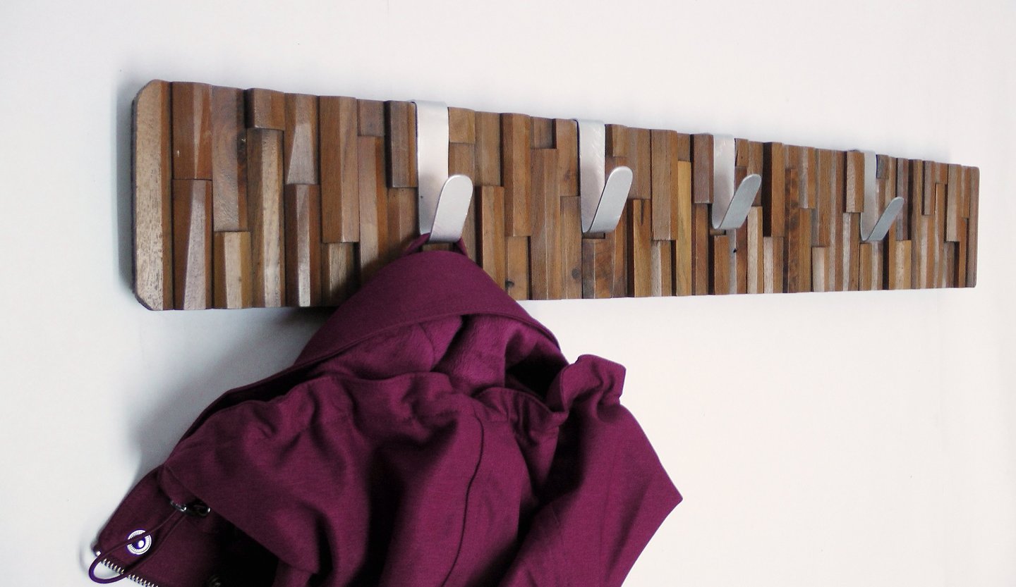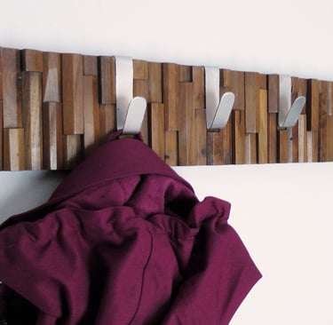This coat rack is an object design project created from marquetry residues, a fine wood material discarded during a renovation process. Custom-sized metal hooks were adapted as secondary elements to complete the piece. The project focuses on reclaiming the value and functionality of materials discarded by others, transforming waste into a functional everyday object.