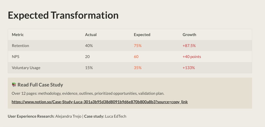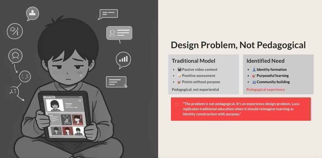 Drawing on frameworks such as Self-Determination Theory, Flow, and Hedonic Adaptation, the analysis shows that Luca falls short in providing identity, purpose, learner agency, and community—key elements for sustained engagement. The proposal outlines a product transformation—from “consumable lessons” to identity-driven missions, learning archetypes, formative feedback, and collaborative dynamics—supported by a clear validation plan to reduce risk before scaling, with the goal of improving retention, voluntary use, and perceived value for students, teachers, and families.