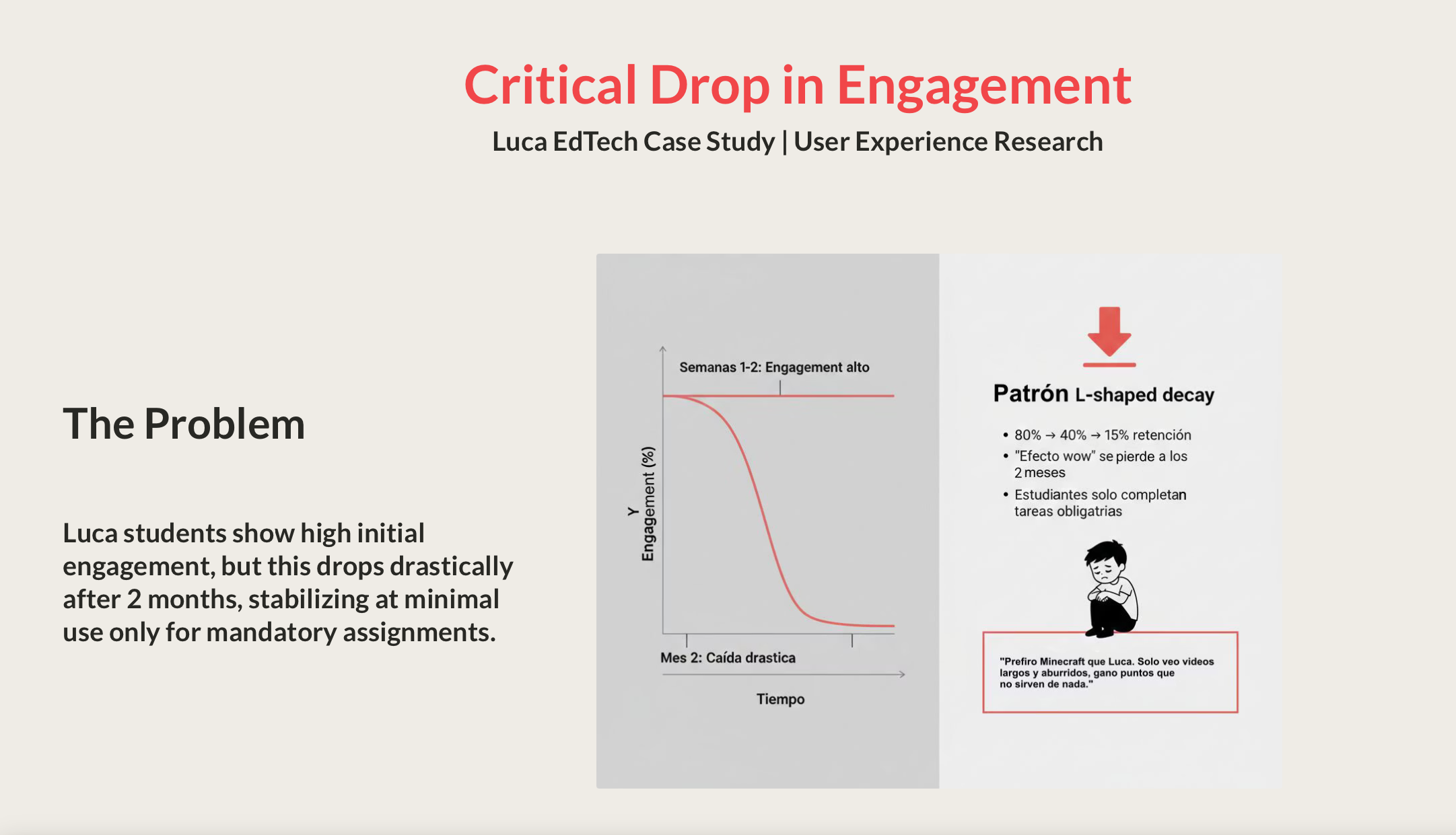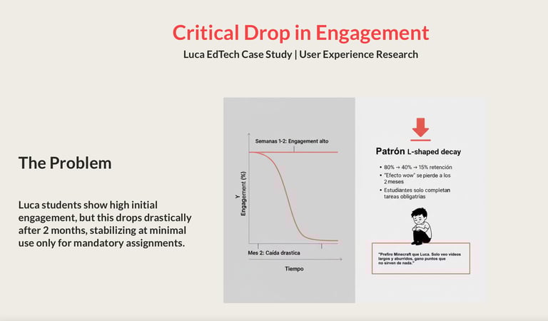 This engagement research case study on Luca EdTech identifies that the sharp drop in student motivation after the novelty effect is not a pedagogical issue nor a school adoption problem, but rather an experience design challenge: the platform relies on a passive, linear educational model driven by extrinsic rewards, which fails to sustain intrinsic motivation in the medium term.